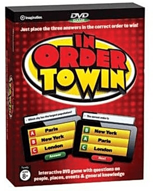 A quiz-like game that uses a DVD to present the questions and solutions randomly, whilst players place a list of items in order by writing on a dedicated scorepad. E.g. Which Alice in Wonderland character appeared first? A: White Rabbit B: Dormouse C: Cheshire Cat (The correct answer is A,C,B) Each game lasts 12 questions over 5 rounds. Each round changes...