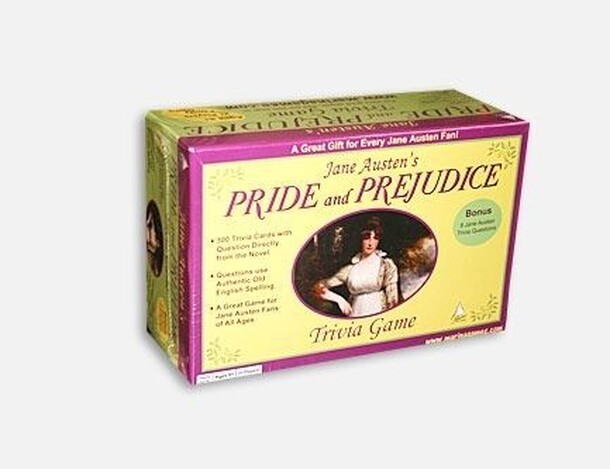 A must have for any Jane Austen fan. Based on the novel Pride and Prejudice by Jane Austen, the game contains 300 trivia cards and 8 bonus Jane Austen trivia questions. Each player/team on his turn rolls a die and is then asked the trivia question from one of the cards. If he answers correctly, he earns points equal to the number rolled on the die and then...