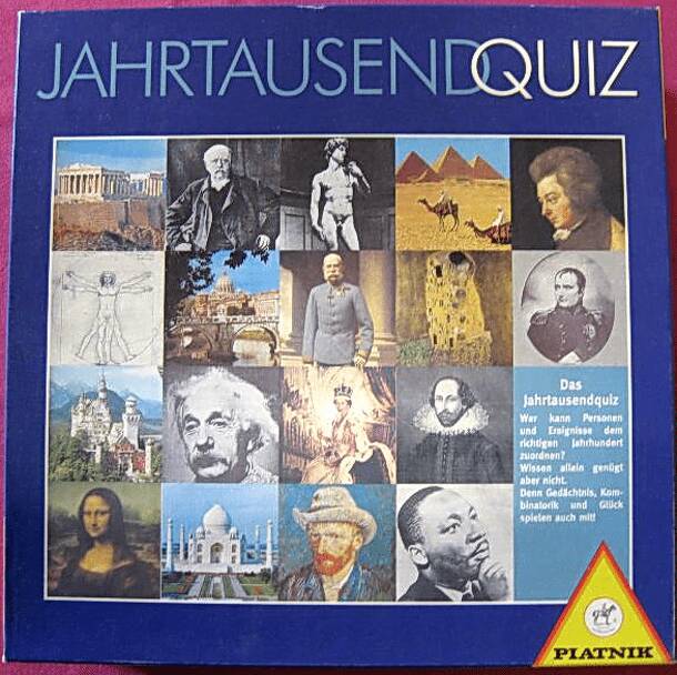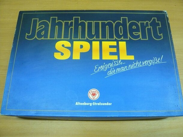 Jahrhundert-Spiel(translates to "Century-Game") is a simple trivia game about the 20th century. The game has about 30-35 question cards for each decade of the 20th century, each listing 4 questions. The game master, who doesn't participate in the game, takes a card for each decade and reads out one of the questions. The first player to answer gets a chip...