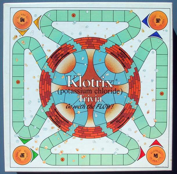 Klotrix Trivia is a promotional product for the Potassium Suppliment Klotrix. The game features general knowledge trivia questions and a special board with a track modeled after the patented fast release of Klotrix. On certain squares, players are allowed to answer an additional question to skip ahead on the track. The winner is the first person to make it...