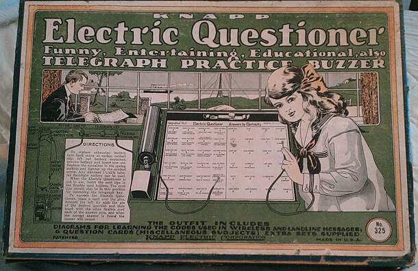 (Info from Ebayer deedavermont) One of the first electric quiz games (circa 1920), the Knapp Electric Questioner had various sets of quiz cards ranging from flags to animals to trivia. Upon completing the circuit by touching the two probes to the correct question and answer a buzzer would sound. The game also included a Morse code key with the code printed...