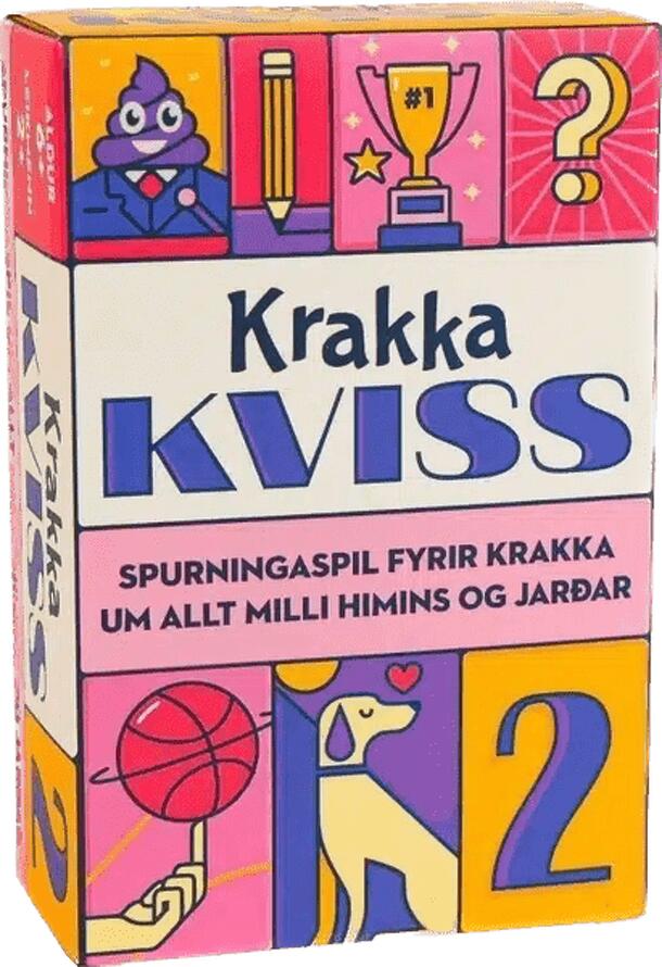 Continuing the success of the popular Icelandic trivia game Krakkakviss, comes Krakkakviss 2, a trivia game for children that spans topics from all over the world. Designed for players aged 6 and up, the game includes 100 cards featuring 300 diverse questions. Sample questions include: "Which animal travels at night and sleeps upside down?", "From which...