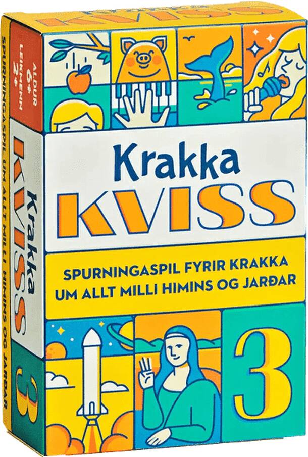 Krakkakviss 3, the latest addition to the popular Icelandic trivia game series, is tailored specifically for younger audiences. This engaging trivia game comes with 100 cards containing 300 questions that cover a broad spectrum of topics suitable for any occasion. Inquisitive prompts such as "What is a super glue?", "Which girl has superpowers in the...