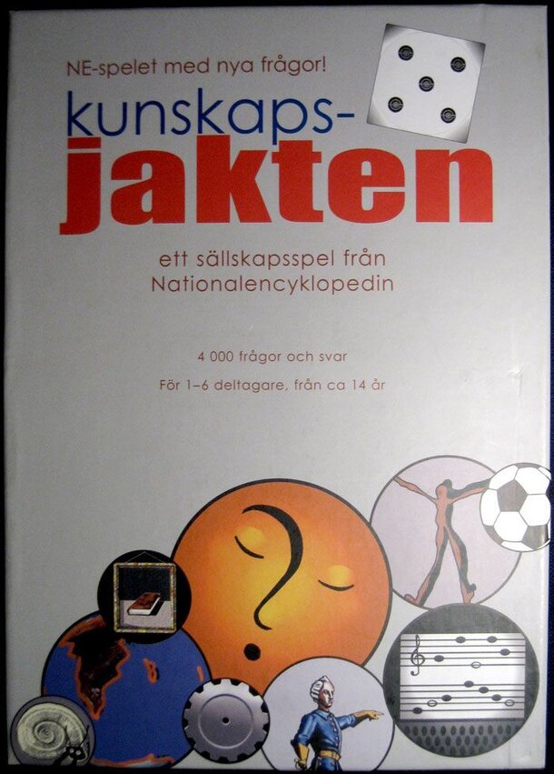 Kunskapsjakten is a trimmed-down reimplementation of NE-spelet with 4,000 new questions compared to 8,000 in the original game. As before, players move around the board and answer questions to assemble trophies (a miniature encyclopaedia) representing ten fields of knowledge. "Kunskapsjakten" is also the name of a single book of 1,000 additional questions...