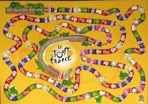 This is the 'official' game of the tour, published in the year the tour celebrated its 100th anniversary. It's a roll and move game (similar to "the Game of the Goose"). Landing an the squares where the different stages of the tour start, lets you draw quiz-cards. You the can choose a sports or touristic question. If you answer correctly, you earn...