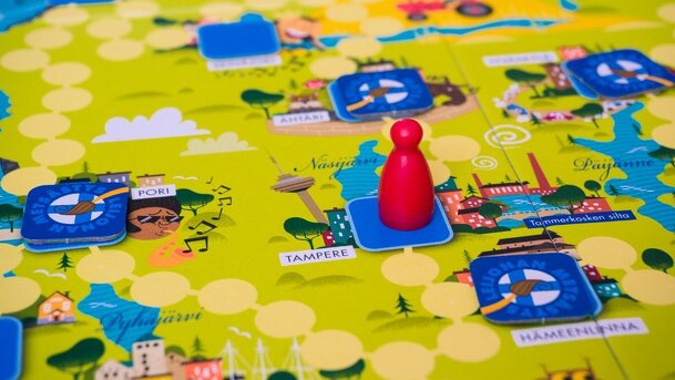 Leijonan Metsästys (Lion hunt) is a roll-and-move game set in Finland. Players move on a map of Finland, trying to find the Finnish heraldic lion somewhere in Finland. In order to examine cities, players must answer trivia questions correctly. Whoever finds the lion, must take it to Helsinki or Ruokolahti. Other players can find "Sisu" tokens and try to...