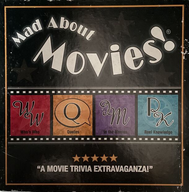 Mad About Movies! is a roll and move trivia game with a Hollywood movie theme. Players answer questions in five categories as they move around the game board, attempting to collect four film frames tokens and then return to the start position. The game has questions in the following categories: Directors, Who's Who, Quotes, In the Movies, and Reel...