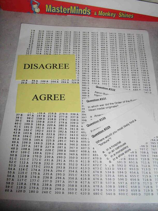Objective: Be the first reaching the target space - acting by turns - The game master rolls the die, draws an appropriate (=matching colour) question asking the player to the left; and if he/she knows the answer the meeple is move forward. There are six different colours matching with six different themes; additionally special cards (1-2-3; yes/no) involve...