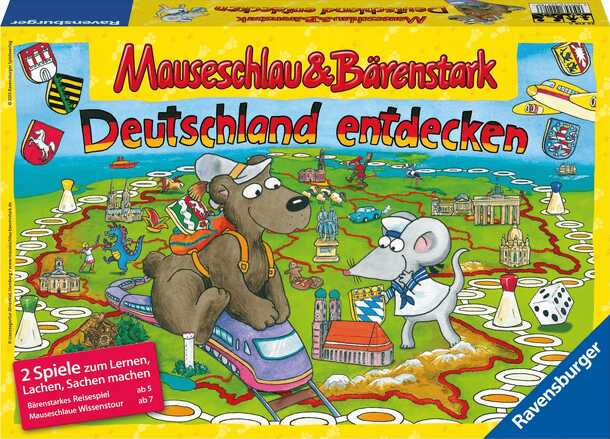 Mauseschlau & Bärenstark: Deutschland entdecken is a roll-and-move and trivia game in which children learn about Germany and its sixteen states. In fact, the box contains two different games: 1) Bärenstarkes Reisespiel (ages 5 and up) In this roll-and-move game players visit the regional capital cities. The first player to reach a city wins the state's...