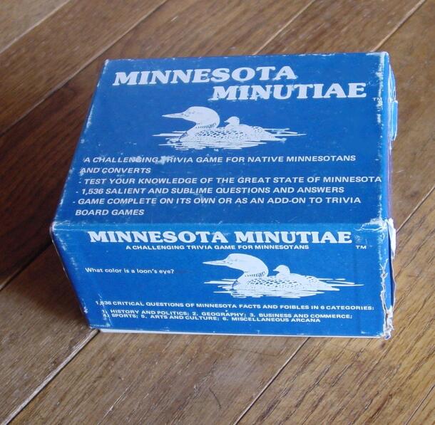 A trivia game focused around Minnesota, similar in style to Trivial Pursuit: Genus Edition. Players roll dice to move around a map of Minnesota, and collect cards by answering questions correctly at starred cities. First player to six cards wins, although longer and shorter variants are suggested by collecting more or fewer cards. Questions are separated...