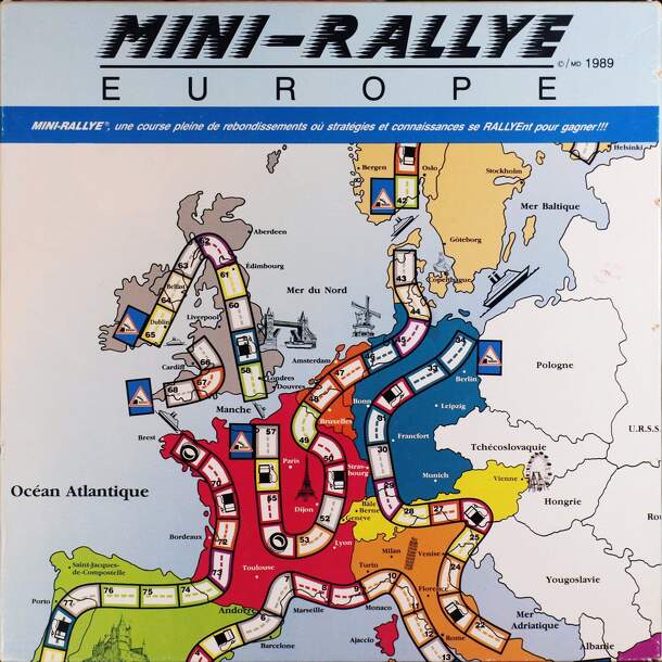 In this roll and move trivia game, players race across Western Europe answering questions about the various countries or areas in which they visit. The questions cover subjects of, among others, history, literature, fine arts, geography and economy. Each player has a small deck of cards that they can exchange for advantages (extra dice of movement...