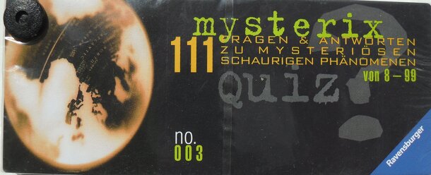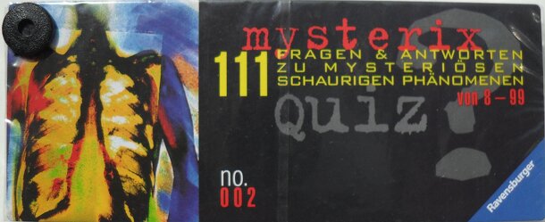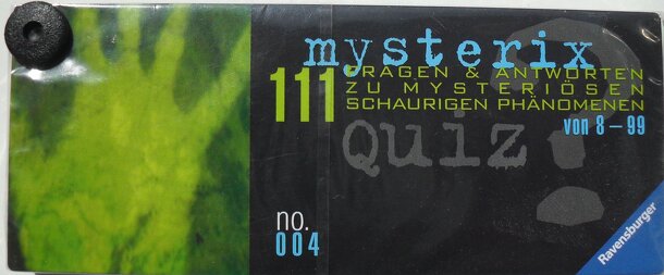 111 questions and answers to mysterious, hair-rising, spooky or horrific subjects can be found in each of the four packets, shaped like a fan and based upon the Quiz & Co series. Each card is divided into a yellow and a black part, in the yellow part one finds numbered questions, on the next card the corresponding answers, equally numbered, can be found in...