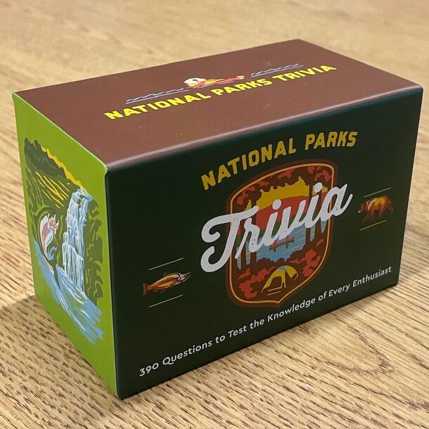 One of a series of Wit trivia games, National Park Wit has 105 cards with questions about National Parks. On the back of each card is a different photo from a National Park and a point value from 1-10 and 15. On the front of each card are three trivia questions and answers, as well as a description of the picture on the back. In turn, each player is asked...
