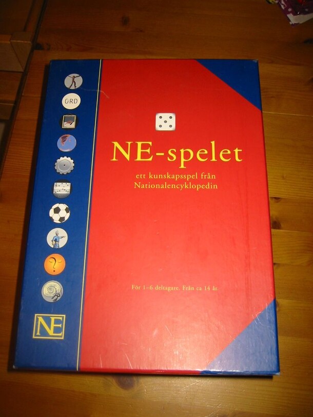 NE-spelet (`the NE game´) is a Swedish trivia game published by Nationalencyklopedin (the Swedish National Encyclopedia). Plays a lot like Trivial Pursuit but with some differences. Players move on the board and answer questions in ten different topics. On the board are ten `topic rooms´ where players receive a plastic `book´ if they answer the question...
