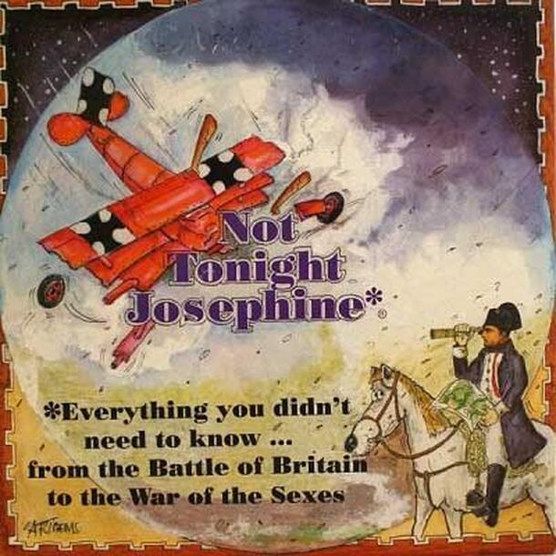 Not Tonight Josephine is a historical trivia game. The game includes glass bead gaming pieces, a colorful board and question cards, many of which are also in color. There are two boxes for the cards, and cardboard coins, as well as dice. There are 30 different question categories on the board, which uses a circular track with a hub layout. The question...