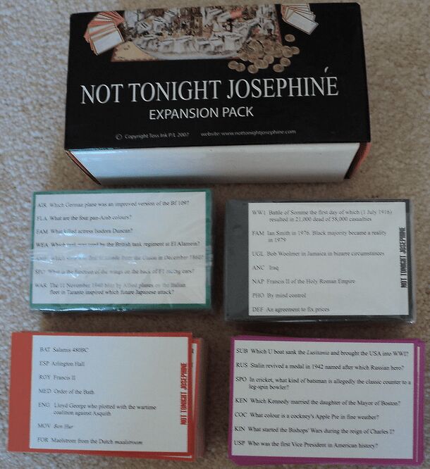 This expansion for Not Tonight Josephine comes as a standard size box of trivia questions the same size as the base game, or the more well known boxes from Trivial Pursuit. As well as new questions new rules are included for how these different format questions are used in the game. This time instead of questions from two random categories there are four...