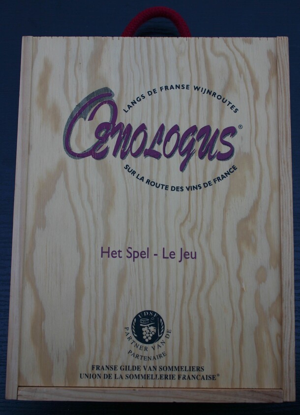 The Union de la Sommellerie Française (French Union of Sommeliers) created this wine-trivia as a relation gift. The nice wooden box contains a map of France, 6 bottle-meeples, 1 die and 8 sets of 44 cards. On each card, you find 3 questions on wine (in general or questions about a wine region). Players have to roll the die and answer a question. If the...