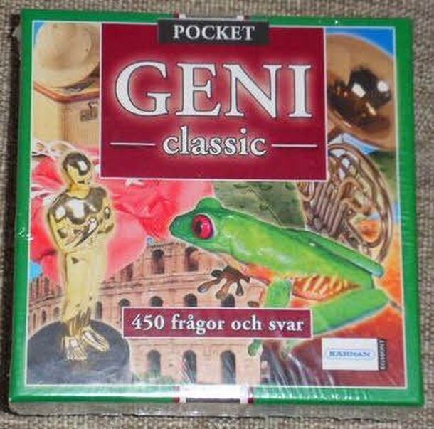 This is a Swedish trivia game all about sports, in a travel edition. Players roll a die to determine what category of question to answer. If they answer it correctly, they get to mark one such symbol on a score sheet. The goal is to score a complete line across the score sheet. There is also a twelve-sided die with "GENI" on some of the faces. If a player...