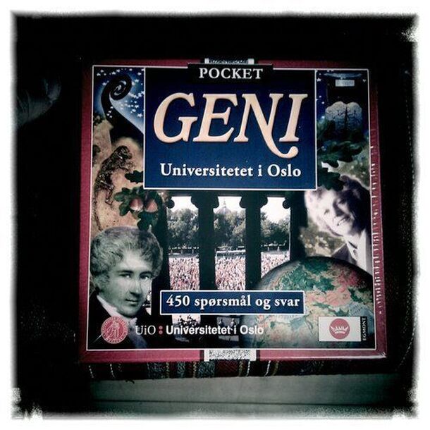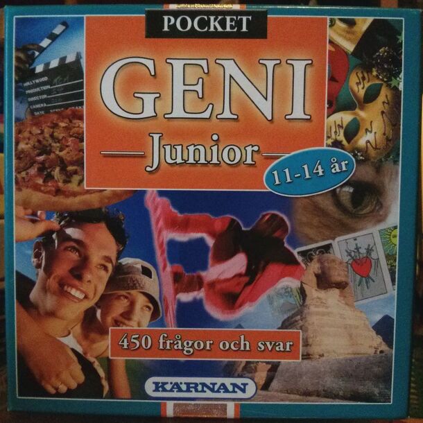 This is a Swedish trivia game for Ages 11 - 14, in a travel edition. Players roll a die to determine what category of question to answer. If they answer it correctly, they get to mark one such symbol on a score sheet. The goal is to score a complete line across the score sheet. There is also a twelve-sided die with "GENI" on some of the faces. If a player...