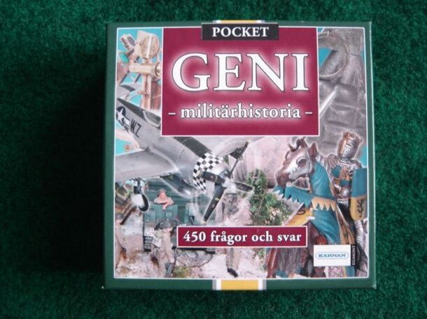 Swedish trivia game in the Geni series. This one is co-published by a military history book club/association. Questions on Swedish and international military history written by colonel Einar Lyth. Contents: 75 cards with 450 questions on military history One pad of score sheets 2 special dice 1 pencil 12 years and up. Playable in teams, so in theory it...