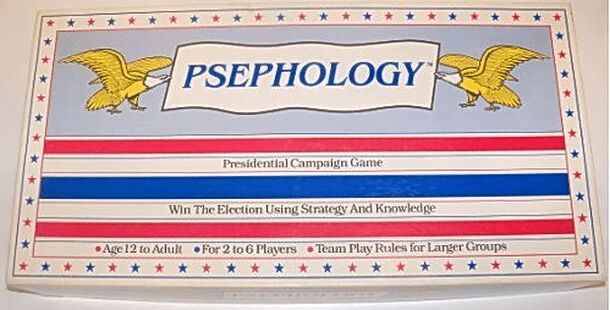 From the box cover and Rules of Play: Presidential Campaign Game - Win the election using strategy and knowledge. The object of Psephology (se-fahl-uh-gee) is to be elected the president of the United States. The first candidate to win at least 100 votes and then move to the White House is the winner. Psephology (from Wikipedia...