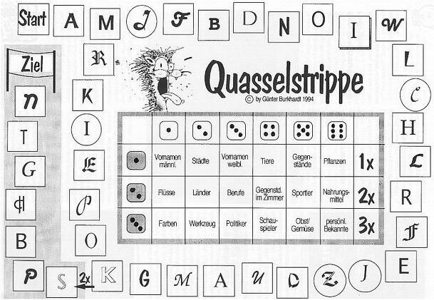 The title translates as tattletale or motormouth. A trivia party game for 2-8 people, it may have been first published February 1994 Spiel im Heft Spielzeit (Playtime Magazine). See designer's website http://www.burkhardt-spiele.de/Quasselstrippe.htm for a copy to print and play (in German). You will want to use die of different colors. It looks as though...