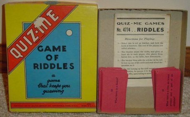 Perhaps one of the older trivia games published, Quiz Me: Game of Riddles is simply a trivia game with trick questions. The player who answers the most questions correctly wins. For example: Question #10 is "I am a mixture of gases, a carpenter's tool and carry the U.S. mail. What am I?" The answer is "Air-plane." Game #4774 made in 1940 by Milton Bradley...