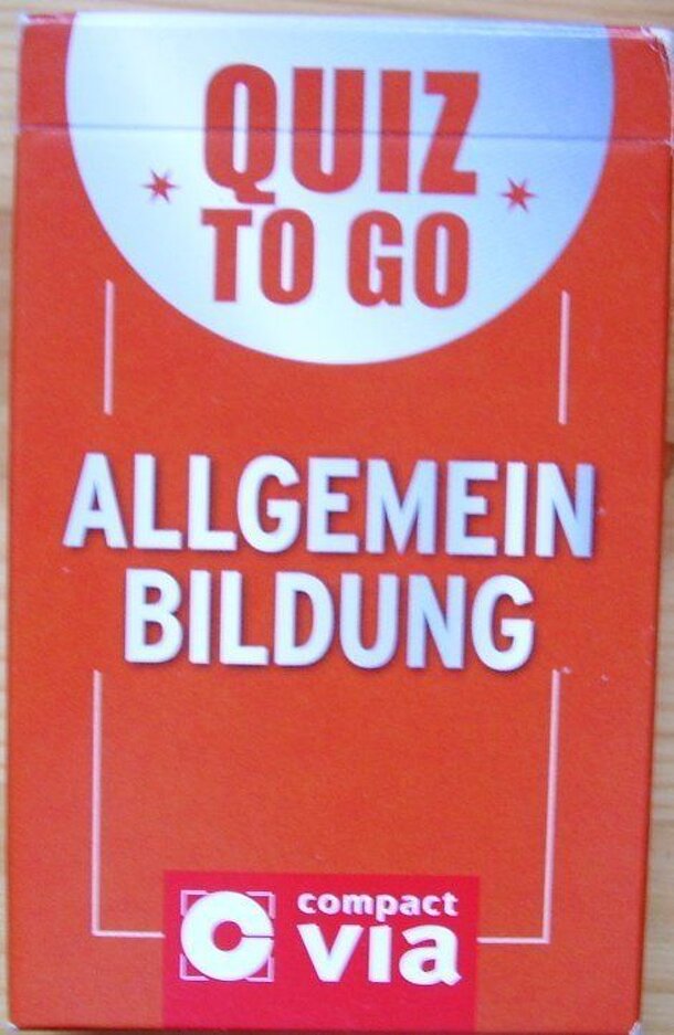A trivia game with the following categories: - Entertainment - Animals and plants - other stuff - Curiosity - History - World and Techniques Each players decides for a category and answers a question. If the answer is correct the person can move in the corresponding category one step up. Each card contains two questions: one for childs and one for adults....