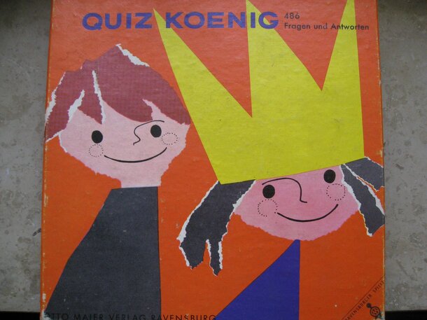 Objective: gain as many quiz-cards as possible giving correct answers; become 'Quizkönig' and gets the crown. - acting by turns - Active player draws a card asking clockwise - correct answer? hand card over.. - if not, try yourself finding correct answer; if unsuccessful - ask next player; round ends after each player had an active task. Open questions are...