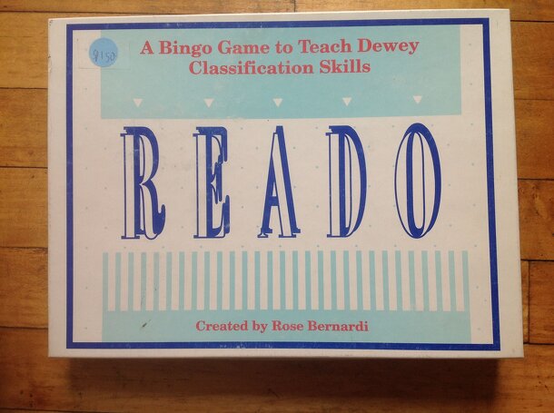 Reado is a Bingo variant where the entries are Dewey Decimal classifications. The caller gives a letter (R, E, A, D, or O) and the title of a work, for example "R -- The Complete Plays of Shakespeare." Any player who has the appropriate Dewey Decimal number for that work (in this case 800) in their R column marks it on their Reado board. A player wins when...