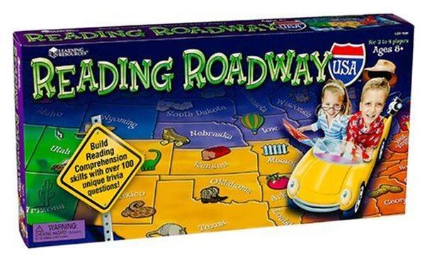 From the manufacturer: Travel the USA discovering fascinating facts while building reading comprehension skills. Players take turns spinning and moving their cars across the country reading aloud fun-filled facts based on the state they landed on. The first person to comprehend and correctly answer the trivia question asked collects a souvenir. Be careful...