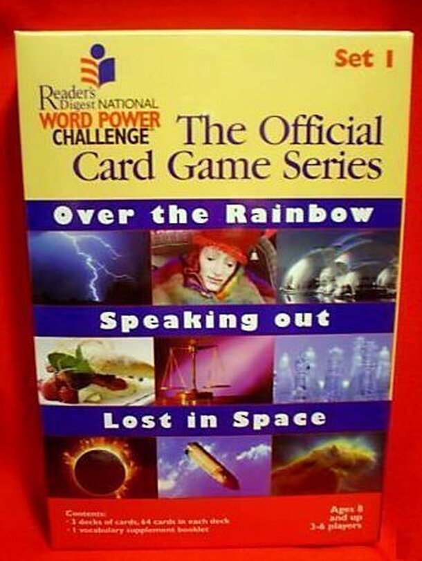 The box that I received is "Set 1" in the official card game series. It contains three decks of 64 cards each: Over the Rainbow, Speaking Out, and Lost in Space. Each deck is a themed game of Go Fish containing 16 sets of 4 cards each. However, the cards contain advanced vocabulary words from Reader's Digest Word Power columns. The four facets of each card...