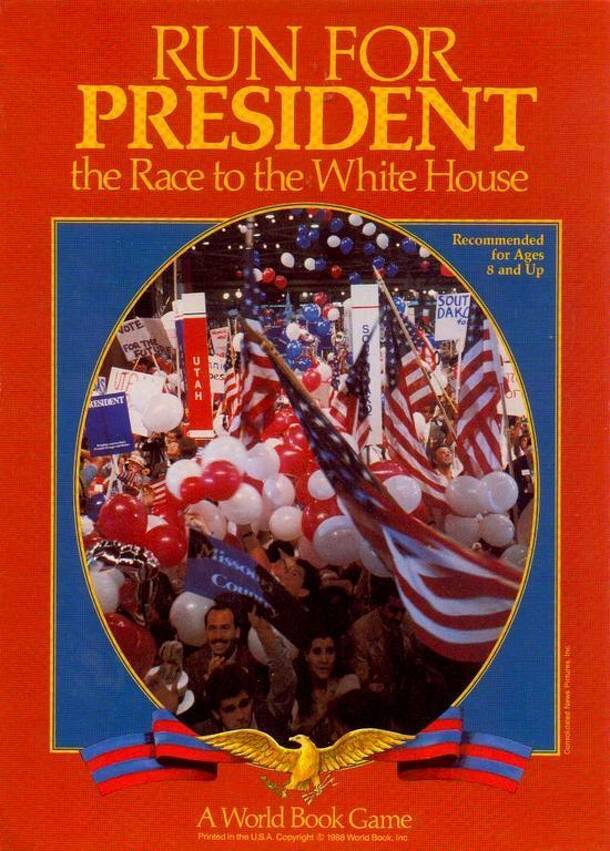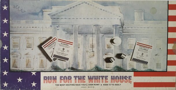 This is a Monopoly-style election game with some add-on trivia. Each player starts with $5.5 million and rolls dice to move around the 62-space track. A player landing on a state space may pay $20,000 times its electoral votes to win it. If he doesn't want to or can't pay, the state goes up for auction. And if the state is already owned, the player pays...