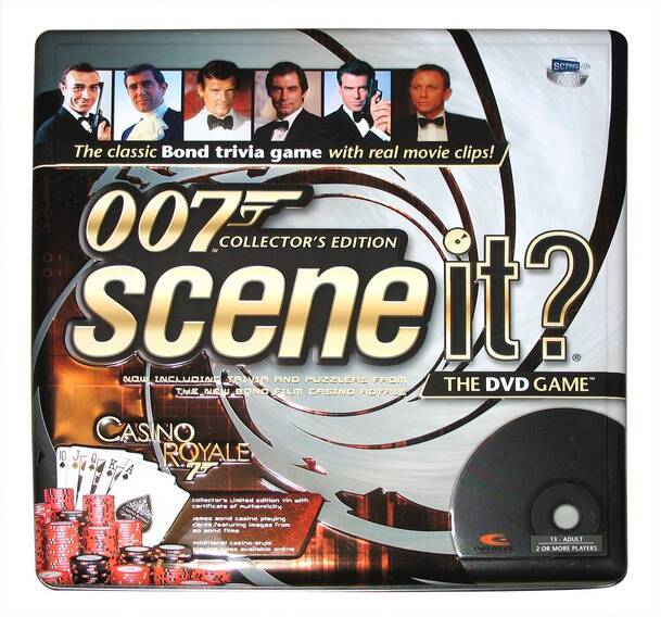 An updated version of Scene it?'s 007 game packaged in a collectible tin. This edition includes new questions and puzzlers from Casino Royale. Includes Cartamundi Playing cards featuring images from 20 Bond movies and 6 new collectible metal tokens. This edition also adds additional Casino Style playing rules on the DVD. From the publisher: A must have for...