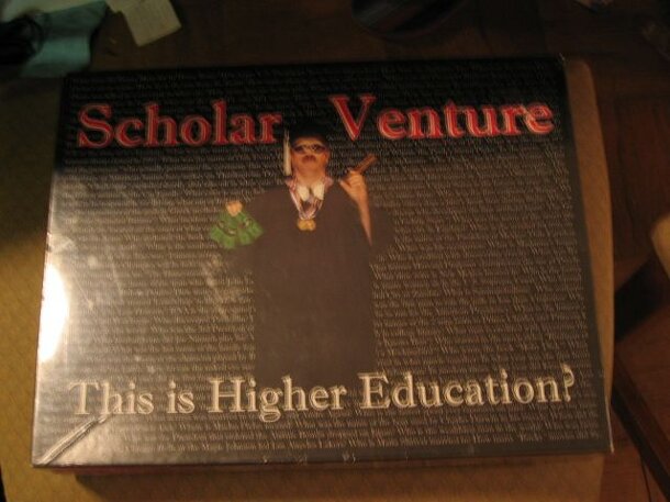 This is the now OOP self-titled boardgame from Scholar Venture. They now make card games (Pimps & Hos, You Go to Hell!, Who Really Has The Huevos?). As far as # of players, I'm not quite sure what "Up to 6 teams of 2 or 3" means, so I am entering 4-18, which is my interpretation. 2002 Mensa nominee for best mind game. Manufacturer's Blurb: Scholar Venture:...
