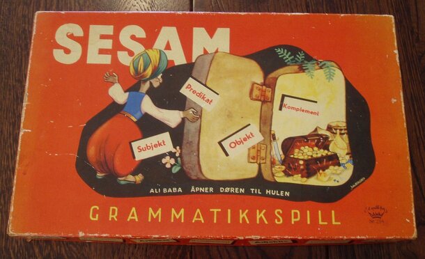 Full name of the game is: Sesam Grammatikkspill - Ali Baba åpner døren til hulen ("Sesam Grammar Game - Ali Baba opens up the cave door"). This is a flexible ruled grammar (educational) quiz game. There are 56 assignments. In the first 28 assignments (each containing 21-28 words/word spaces) your task is to categorize words in their correct word classes....