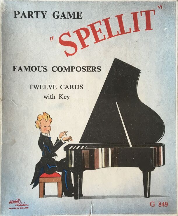 This party game from Dennis Productions is a simple quiz about how to spell the names of a dozen well-know composers. It consists of 12 player cards, and a key card with the answers. The box features an illustration of a piano player in formal dress at the keys of an open grand piano. Each player card has three columns with different spellings for the same...
