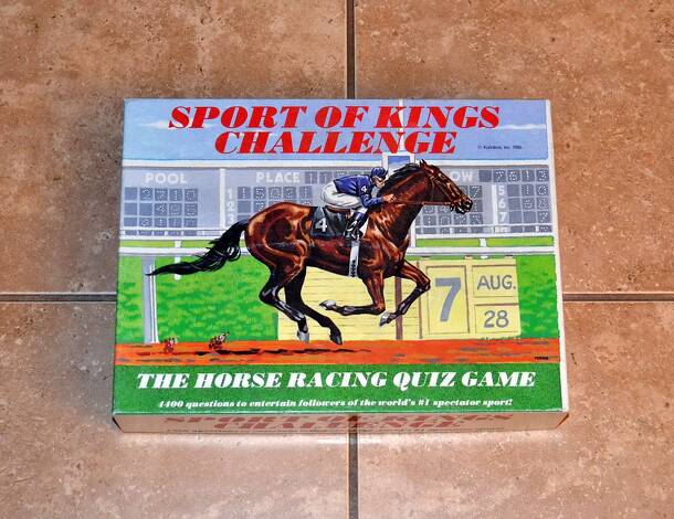 Sport Of Kings Challenge: The Horse Racing Quiz Game "4400 questions to entertain followers of the world's #1 spectator sport!" "A party game! A study guide! A nostalgia trip!" This horse racing trivia game includes a colorful race track board, 6 plastic horses, 6 plastic tokens, hundreds of trivia question cards, a die, and 6 category cards. Players...