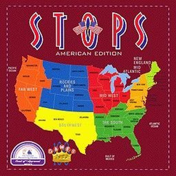 STOPS is an acronym for states, territories or provinces. The STOPS AMERICAN EDITION has 51 STOPS (or 51 possible answers), the names of the 50 states and Washington, DC, all of which are printed directly on the colorful, dynamic game board. STOPS provides you with a clue, and you try to identify the STOP. From an official report: "The award-winning trivia...