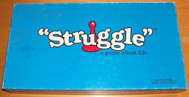 Struggle is a game about life. Each player/team starts with $650. Every time you pass Payday on the board you earn $1,500. You can purchase things like Auto and Life Insurance and 'You're The Boss' cards, make investments and pay bills. Once players pass Payday three times they will draw a 'Last Will' card which will give them a cash bonus or make them pay...
