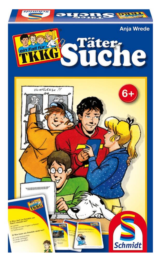 A license game about the childrens crime book series TKKG (Tim Karl Kloesschen Gabi, the 4 detectives including the dog...). Someone spraypainted the neighbours wall. But who was it? The players (detectives) have to choose between 8 suspects that wear different coloured clothing. The culprit is determined by three upside down chips that depict the guilty...