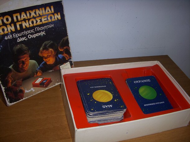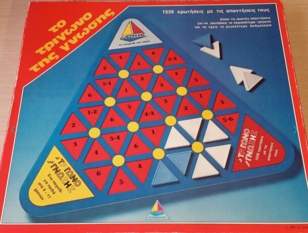 A trivia board game for kids The board is a big triangle with 36 smaller triangles in it. Each triangle has one or two numbers inside. On his turn, each player first put a pawn in a small triangle of his choice, then draws a card and answer the same number of questions as the number in the triangle. If the answer is correct, he puts a triangle tile in...