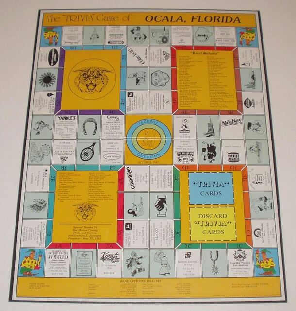 This is a generic trivia style game with an Ocala, Florida business theme. Ocala is the home of an internationally famous horse breeding and training center. The game features a colorful board with locations representing various business locations and tourist attractions. Players move around the board and answer questions. The first player to get all the...