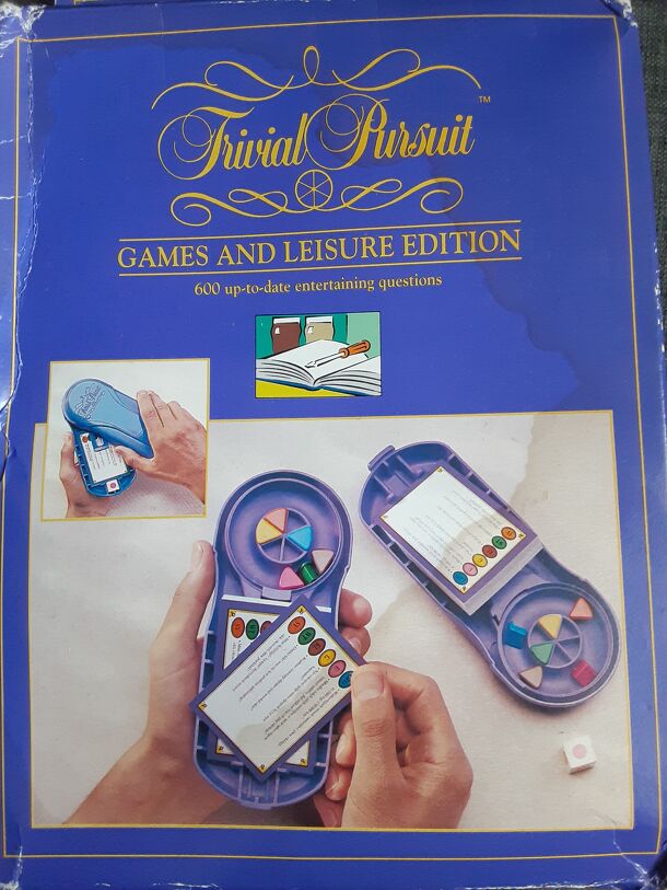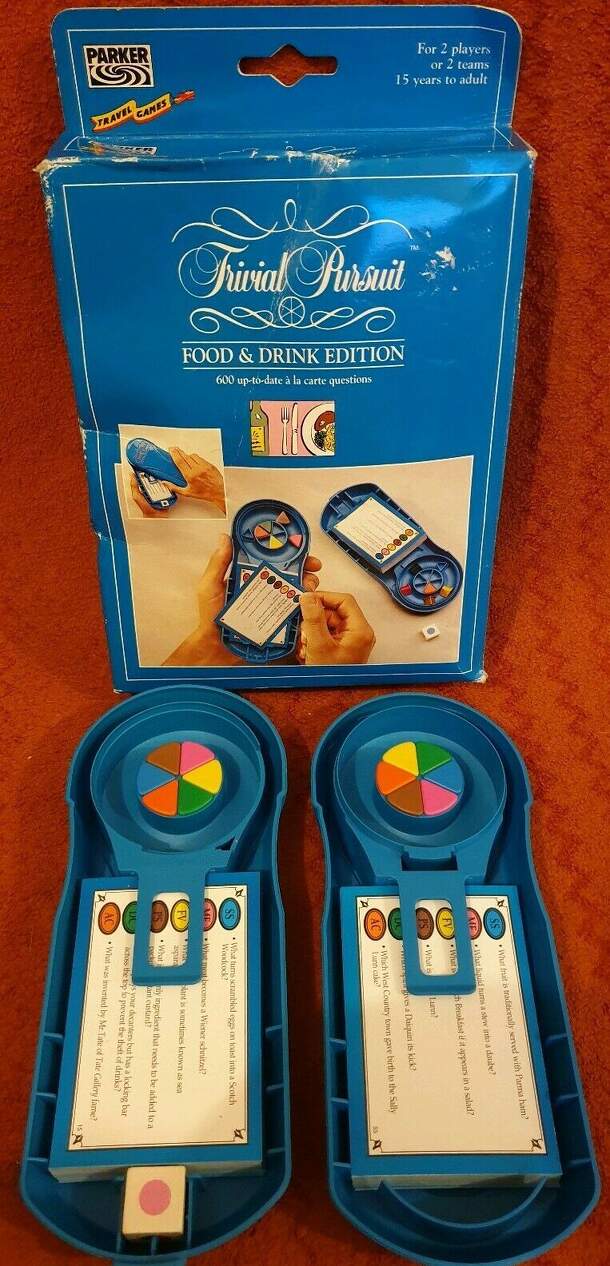 Part of the Parker Travel series. A twp person (or team) travel version of Trivial Pursuit. The carrying case splits into tow halves, each containing 50 trivia cards, and an affixed scoring piece to hold eared wedges. It also includes a die with 6 colors on it, to randomly determine which question is next asked. The categories are: Blue- Music, Music...