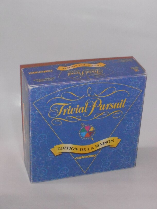 A small edition of Trivial Pursuit. Each player has a circular playing piece with six pie-shaped holes. The goal of the game is to collect a pie in each color. Each color represents a categorie. When a player has collected all the colors, he/she has to move to the middle of the board to win the game. This version was a give-away from the Belgium beer...