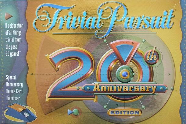 This 20th Anniversary Trivial Pursuit Edition contains 3,600 all-new questions - that celebrate the people and events from the past 20 years. Plus the Special Anniversary Deluxe Card Dispenser keeps your cards organized so you can focus on the fun. The six new categories include *Global View, *The Written Word, *Sound & Screen, *Innovations, *News, *Game...