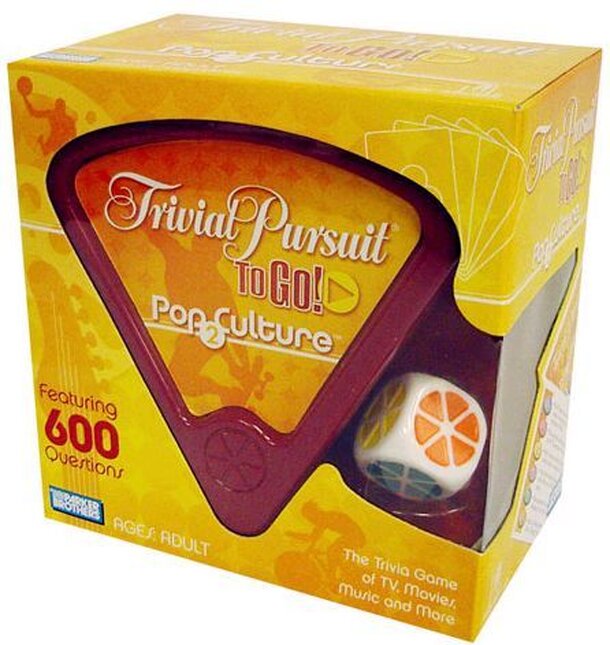 This POP CULTURE edition features 600 questions (on 100 cards) from popular TV shows, commercials and movies, as well as questions about your favorite songs, hot gossip and popular fads. A portable wedge shaped carrying case contains 100 cards, two rule cards and a "wedge die". Roll the wedge-die to determine the category of question to ask. If the...