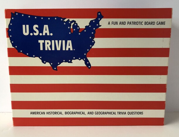 U.S.A. Trivia is a straight-up trivia game featuring United States geography, history and government. Players move on a path looping through the 50 states, beginning in Maine and ending in Hawaii. The color of the state the pawn is resting on determines the color used on the card. Successful answers allow a die roll and another turn, unsuccessful answers...