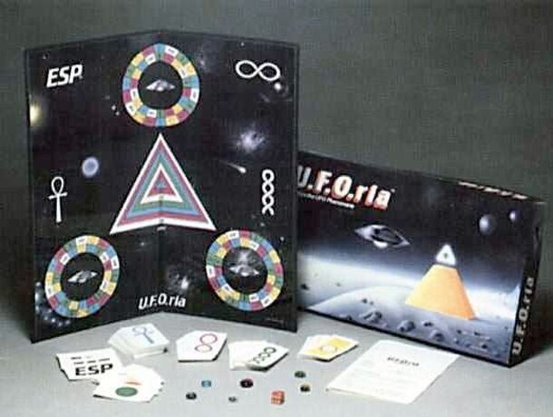 "Object of the Game Travel to all the planets, reach the center of the SEVEN-LEVEL PYRAMID, and answer the final question correctly. In doing so, YOU WILL TRANSCEND ALL SPACE AND TIME AND BECOME IMMORTAL!" A 'Trivial Pursuit' style of card-driven questions and answer with a SERIOUS UFO theme. Players move by die roll around a segmented outer orbit ring...
