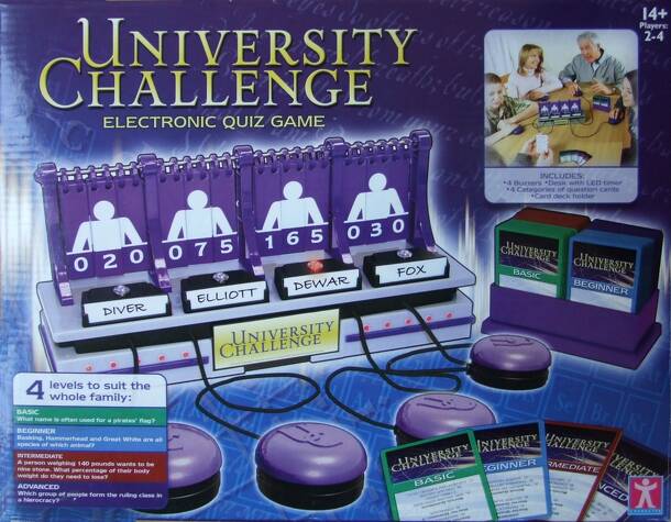 This is a family trivia game based on a popular TV quiz show in England. There are four categories of trivia questions with difficulties ranging from basic to advanced, which makes the game more suitable for a family. The game includes a buzzer and a flip card scorecard for each player, and a timer for the game. Whoever is in the lead when the timer goes...
